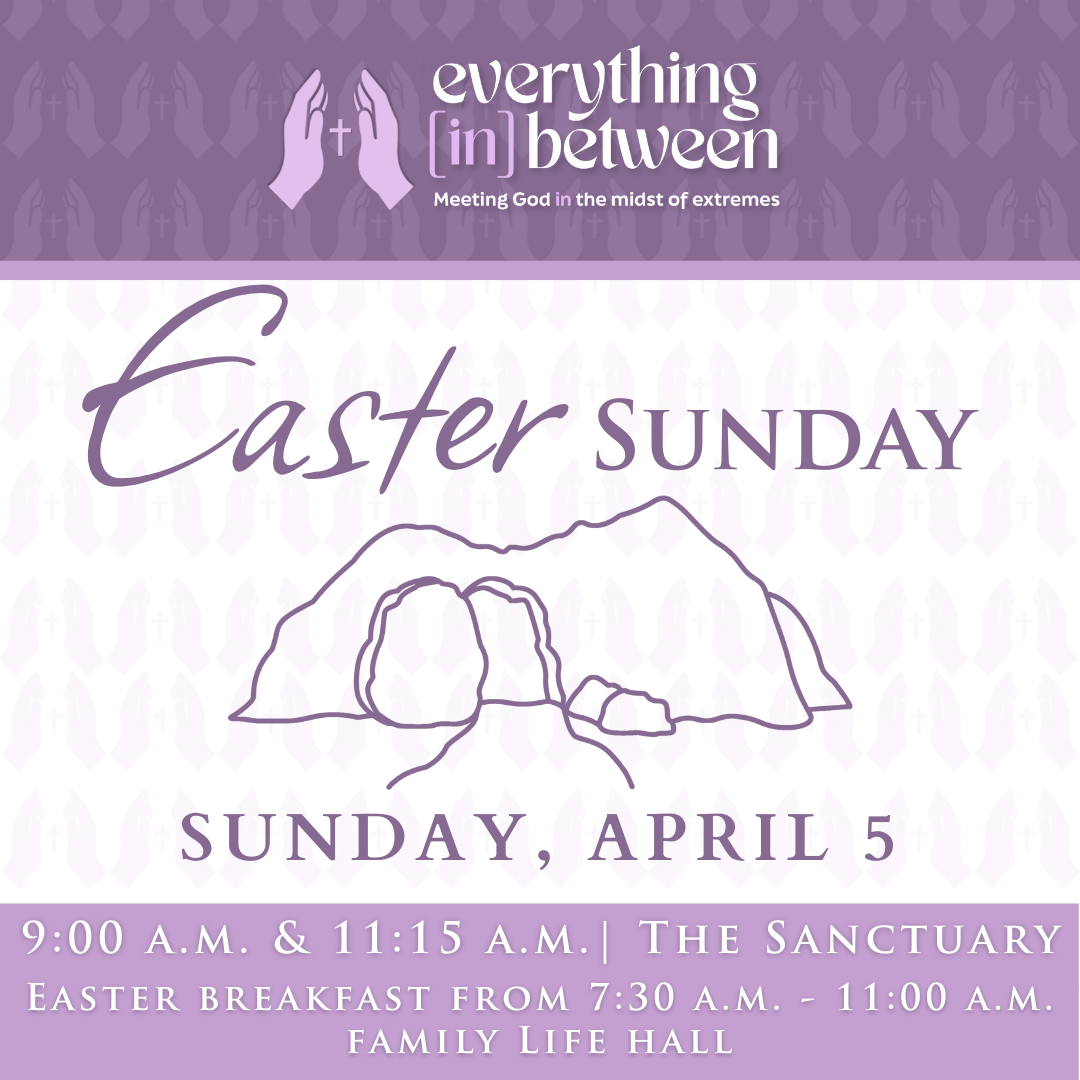 Join us for Easter Sunday worship on Sunday, April 5, at 9:00 a.m. and 11:15 a.m. in the Sanctuary. All are welcome to celebrate the resurrection of Christ.