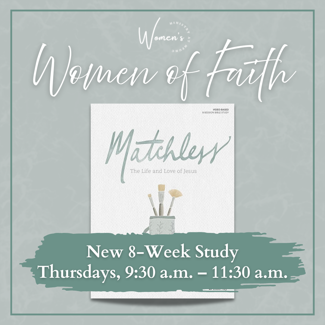The Women of Faith Bible Study will begin a new eight-week study on Matchless by Angie Smith. The group meets each Thursday from 9:30 a.m. – 11:30 a.m., beginning in Room 303 before breaking into small groups for discussion. If you have questions or would like to join, please contact Martha Lee Sanders at trsanders@mindspring.com.